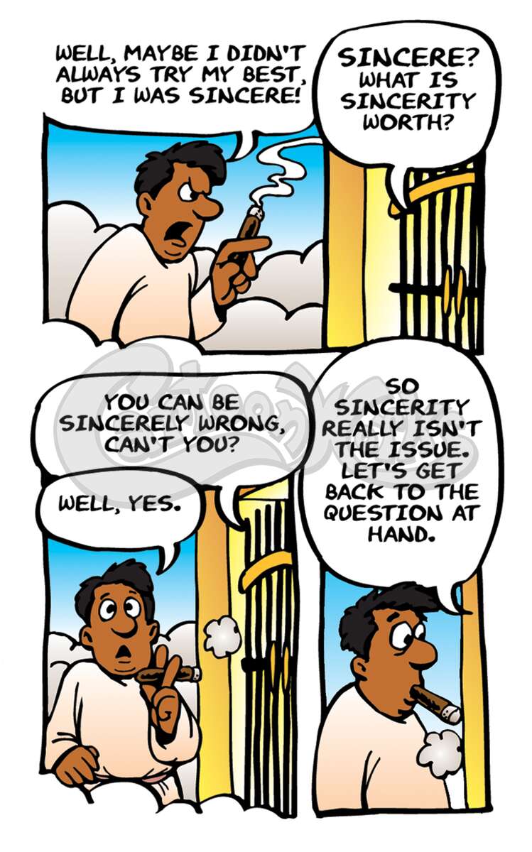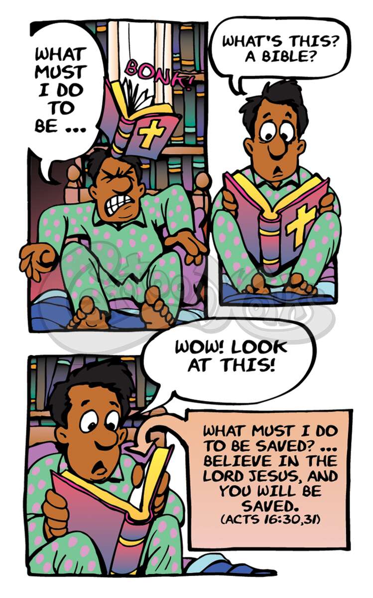 Inspired by "Evangelism Explosion," using primarily people of color, this tract humorously destroys the idea that you can get into Heaven just by being good person. Ron presents the true solution of a personal relationship with God through Jesus Christ. Acts 16:30-31, John 3:16, Isaiah 59:2, 1 Peter 3:18,