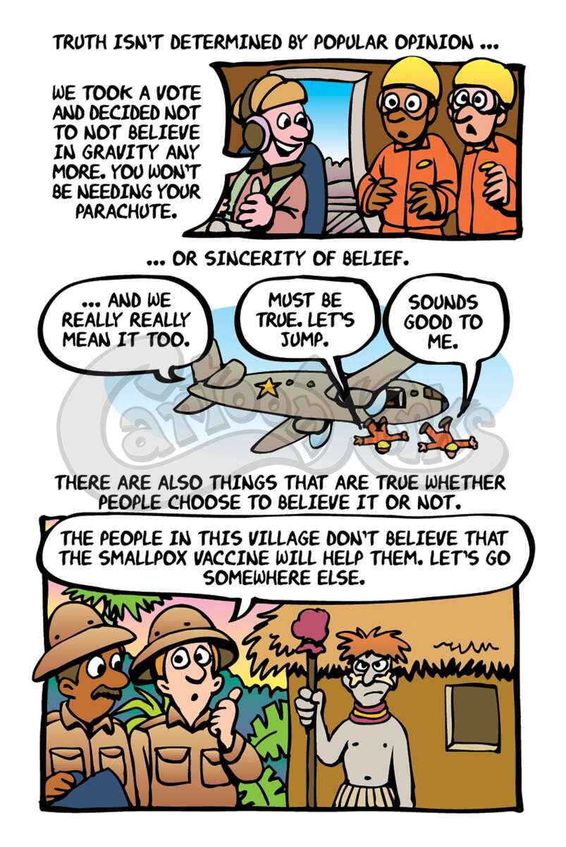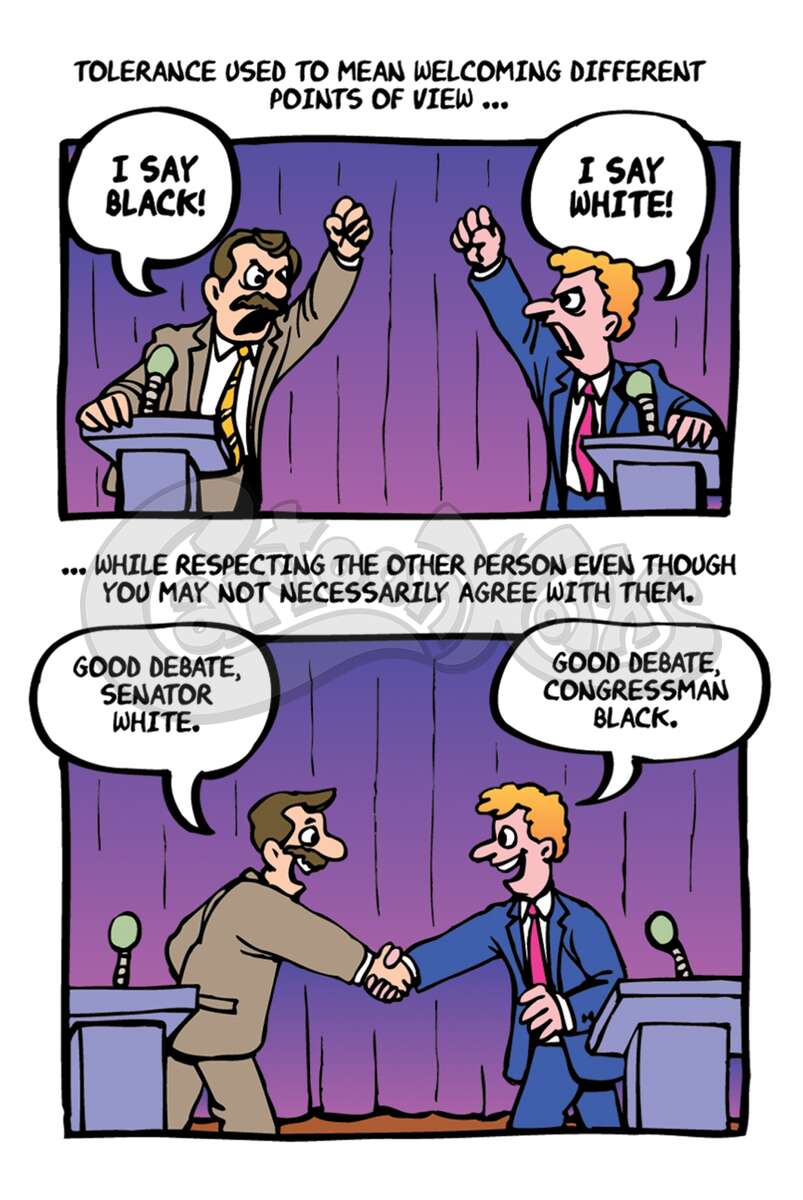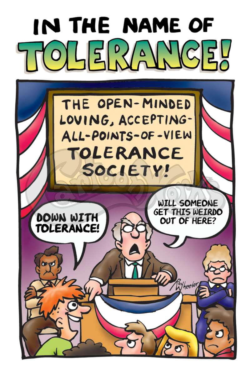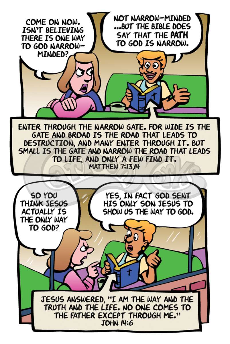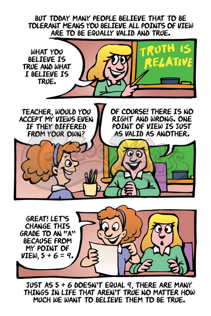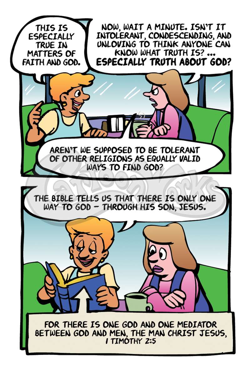 "Tolerance" is a word that is frequently misapplied. Today it doesn't mean respecting each other's differences, it means you have to accept a differing opinion as just as true as your own. This tract humorously pokes fun at this theology and shows the true way to find truth. 1 Timothy 2:5, Matthew 7:13-14, John 14:6, Isaiah 59:2, Romans 3:23, Romans 6:23, Romans 10:9,