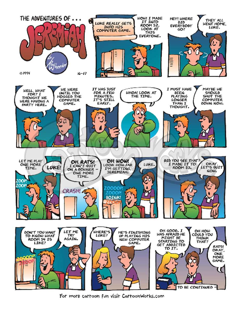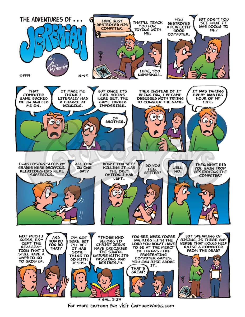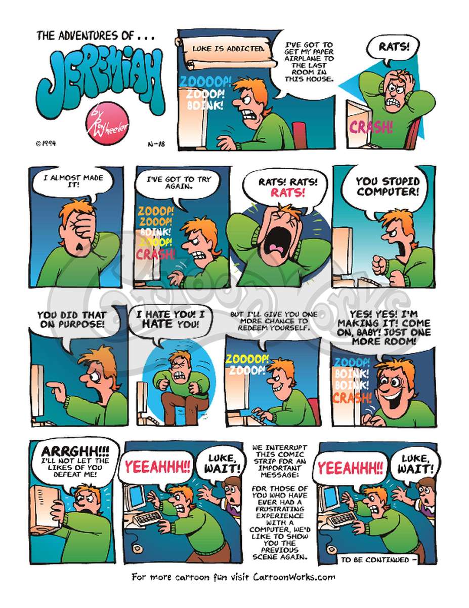 Even though the computer and the game in this comic strip is dated, the gaming obsession is still current. Ron uses humor to reveal feelings we all have when we get “hooked” on something we should be able to keep in moderation.