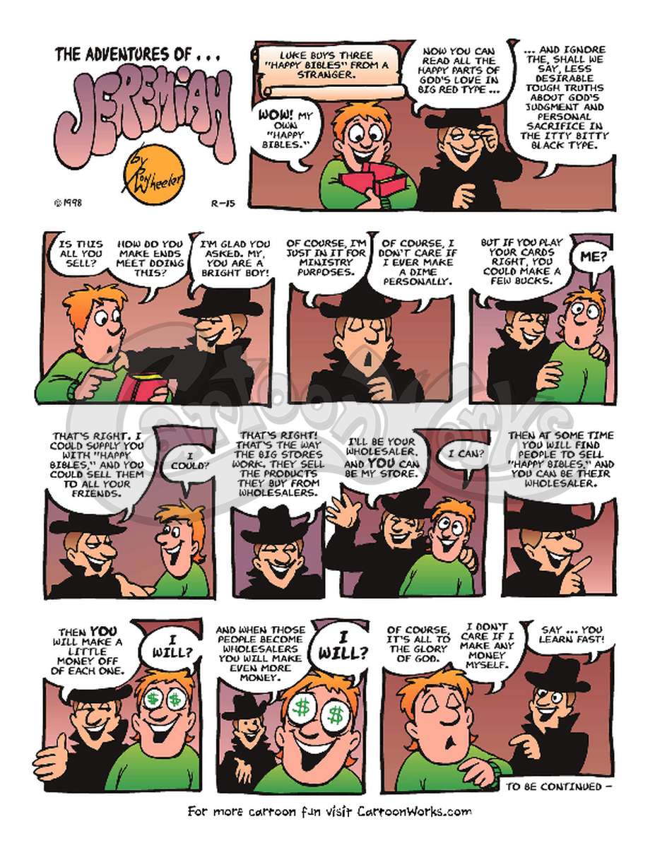 What’s a “Happy Bible” and why are they to be avoided? Luke gets sucked into a scam and with Jeremiah’s help (combined with a little cartoon humor), he learns to face the truth.