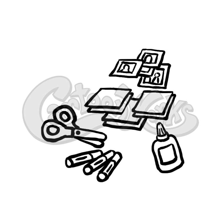 Stamps, Paper, Glue, Crayons, Scissors
