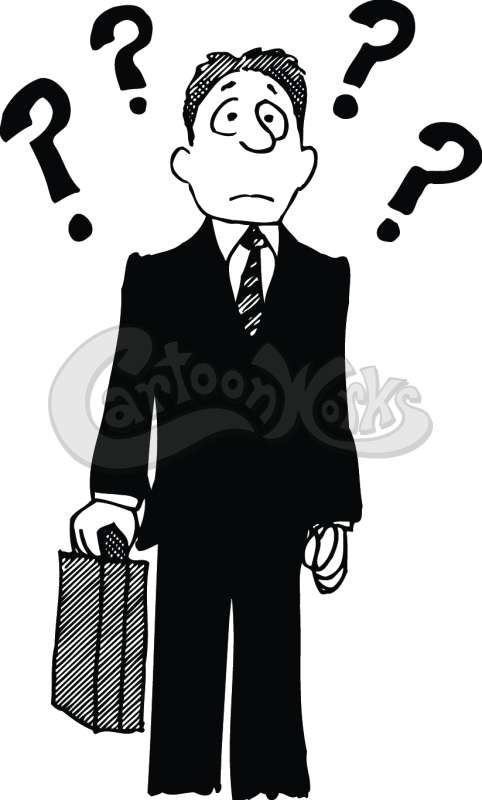 businessman, businessmen, cartoon, cartoons, confuse, confused, confusion, male, males, man, men, office, offices, question, questioning, questions, suit, suitcase, suitcases